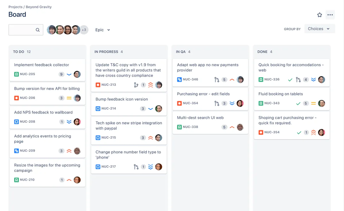 지라의 핵심 기능은 이슈 트래킹이다. 버그, 기능 요청, 태스크를 카드 형태로 관리한다. 스크럼 보드와 칸반 보드를 모두 지원하며, 백로그에서 우선순위를 정하고 스프린트에 작업을 배정할 수 있다. 워크플로우 커스터마이징으로 팀의 프로세스에 맞게 상태 전환을 설정할 수 있다.